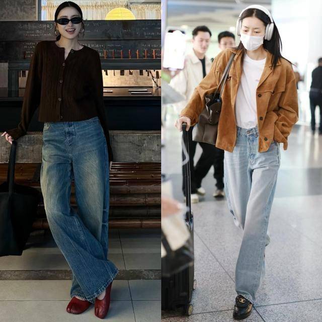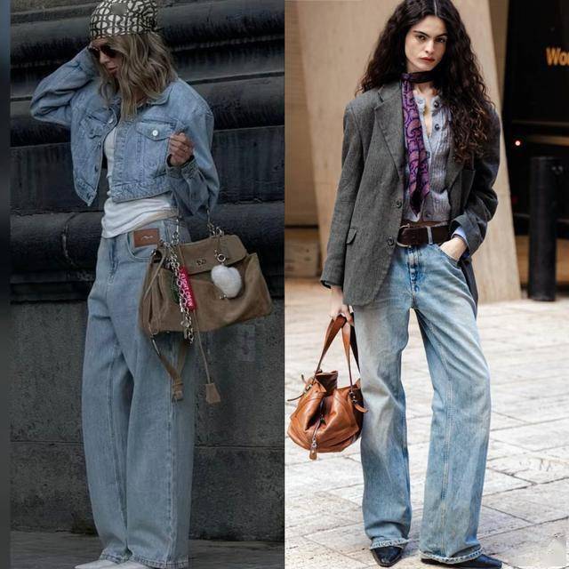 拖地阔腿牛仔裤+西装:裤脚微遮鞋跟,只露尖头显瘦又显高;