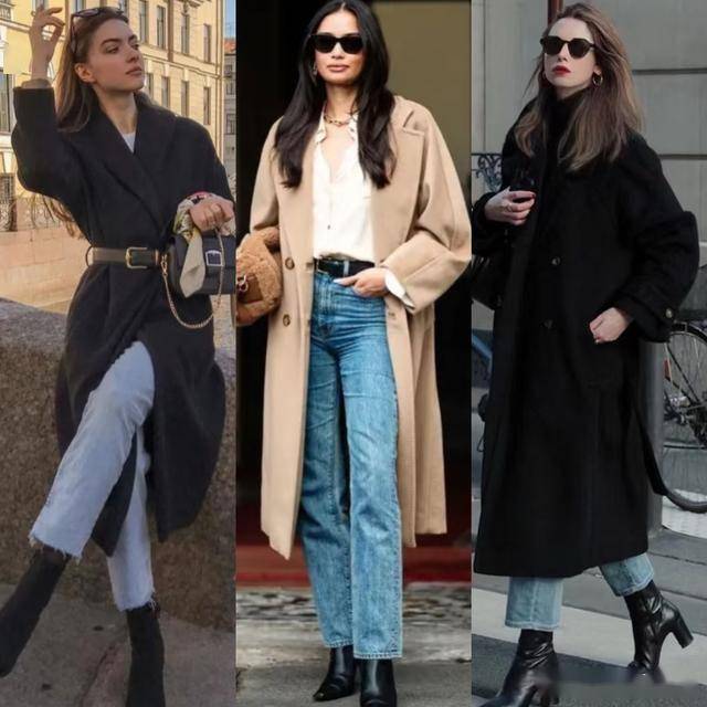 长款大衣搭配直筒牛仔裤,配上黑色切尔西靴,整体是一种利落干练的风格,又不会过时,适合各种场合。