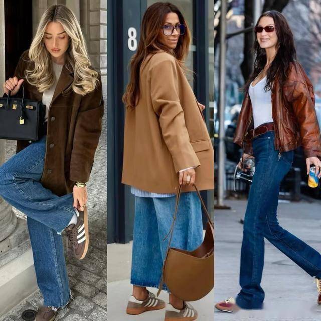 冬天是大地色系的主场,如果你有一件棕色系的外套,可以配上丹宁蓝牛仔裤,冷暖的撞色搭配看起来温暖又清爽,这时候配一双咖色的德训鞋与上衣颜色相呼应,既提升了高级感,又显得格外温暖。