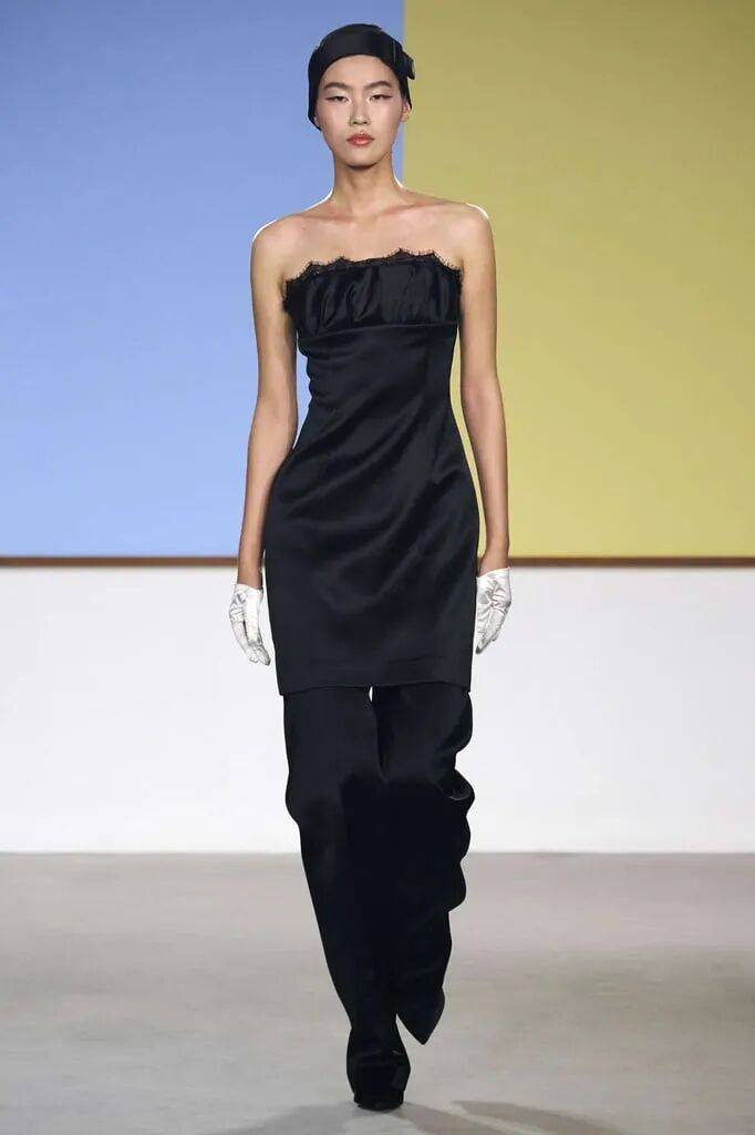 黑色的抹胸套装在这些稳重沉稳的严肃中,纯色的极简大方,抹胸也露出了肩颈的曲线线条感,而直筒裤的搭配也有不少套装的简约利落。