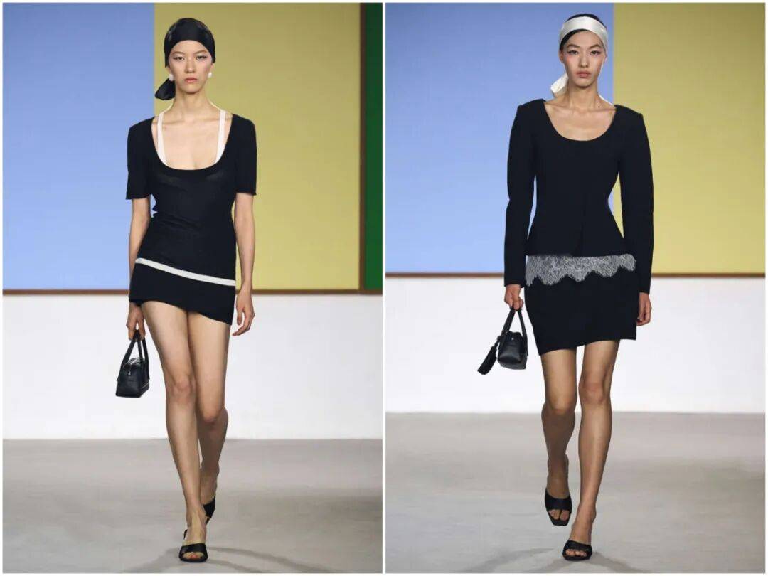 纯黑色颜色的服装,在和编织衣袖的拼接结合、薄纱短裤、高领设计、插肩式的肩袖等这些设计的结合,则让黑色的服装在纯色的简约中也有着更多的特色时尚。