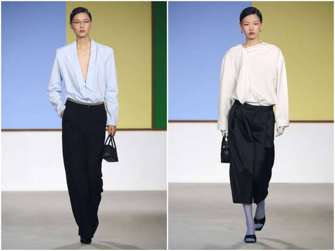 浅色颜色的上衣在深V字、不对称的打结褶皱等设计的结合上,为纯色的上衣增加了不少细节的设计感,而在和黑色等深色下装之间的搭配中,让撞色的效果更为强烈,还在直筒裤的裤装上也多了线条的利落干练。