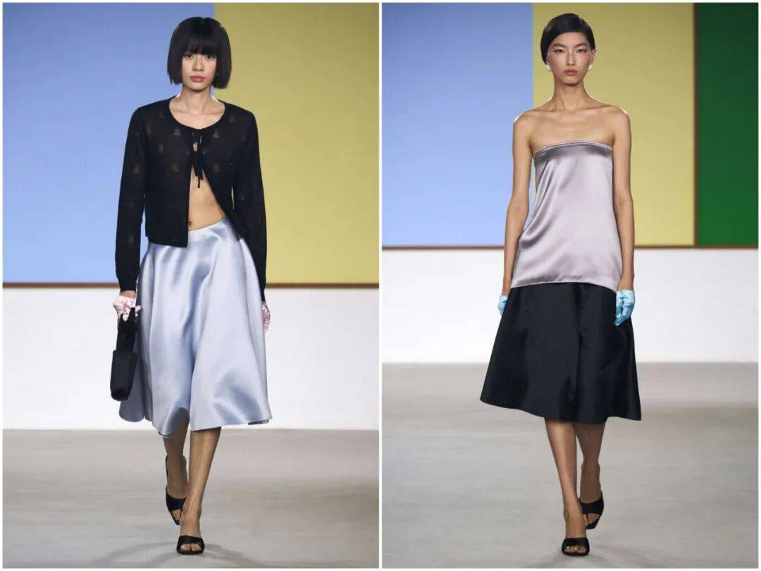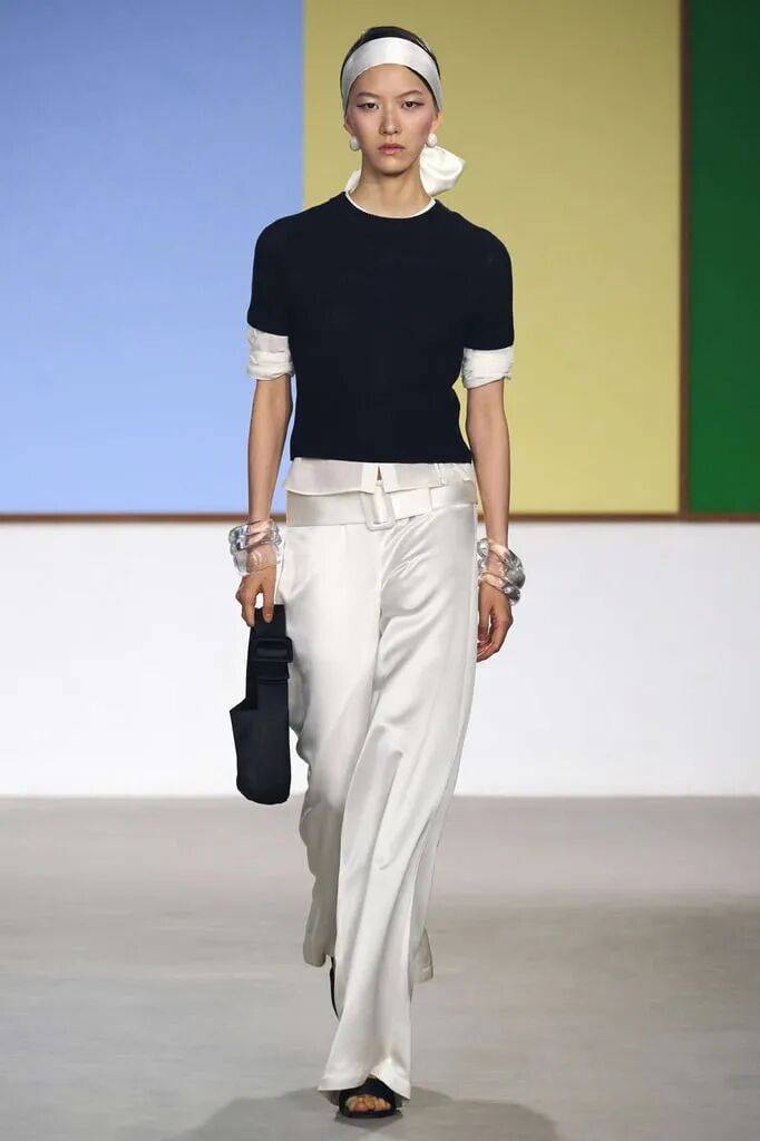 浅色系颜色在低调的气质中,柔和的氛围在光滑的绸缎面料上多了光泽和一些华丽的气质感,而在和纯黑色之间的搭配中,撞色的冲击也凸显了这些浅色部分的存在时尚感。