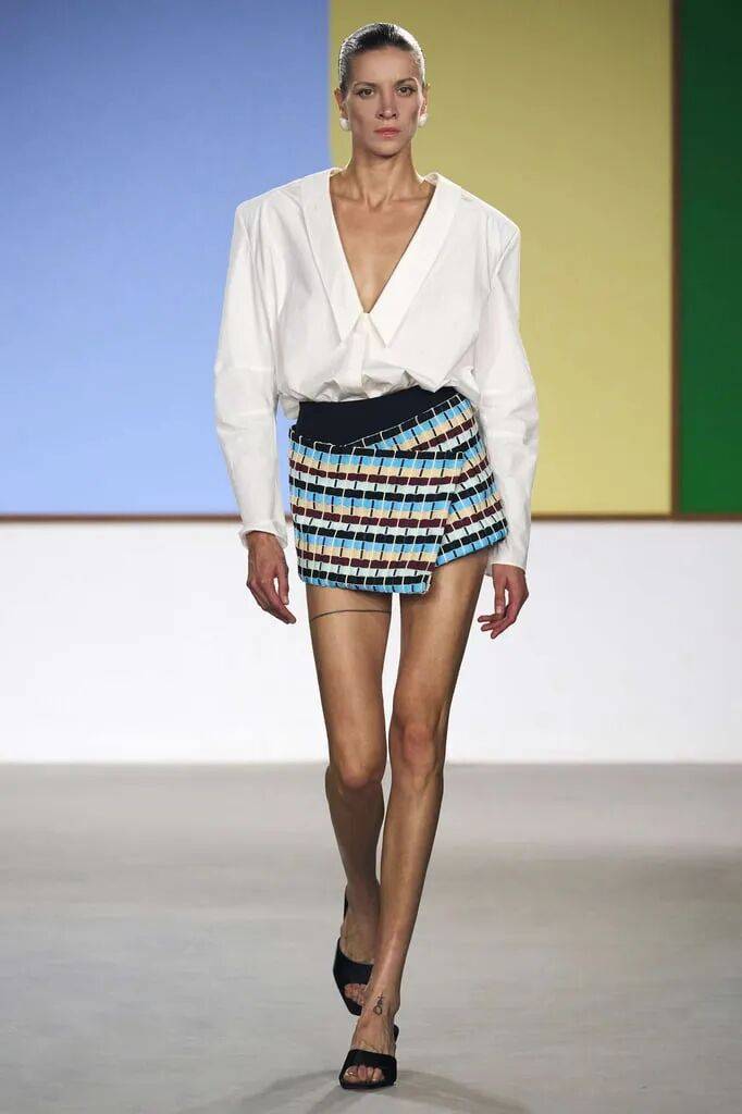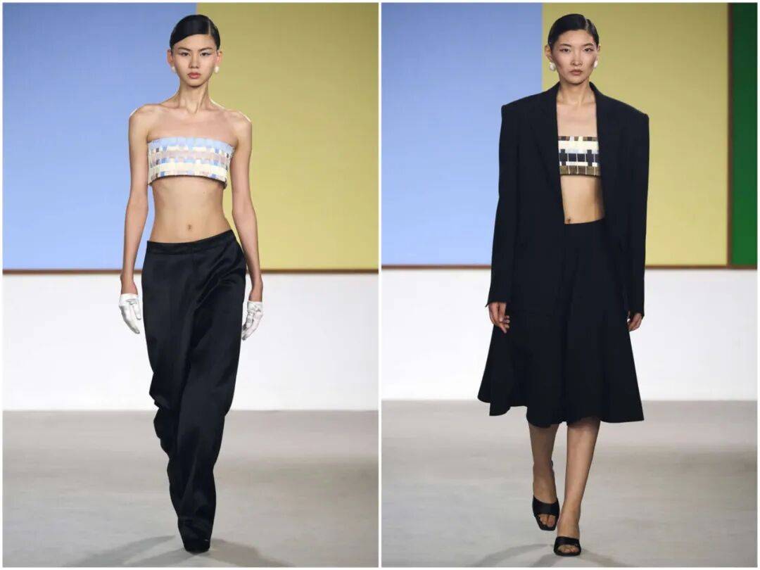 抹胸的服装在上衣的位置,色彩之间的对比搭配在编织的工艺中增加了纹理质感和格纹图案的经典时髦气质,在身侧的位置以流苏的设计增加了一些细节和不对称的冲击感;而搭配中,经典百搭的纯黑白色彩作为裙装,凸显了编织花纹上衣的存在感。