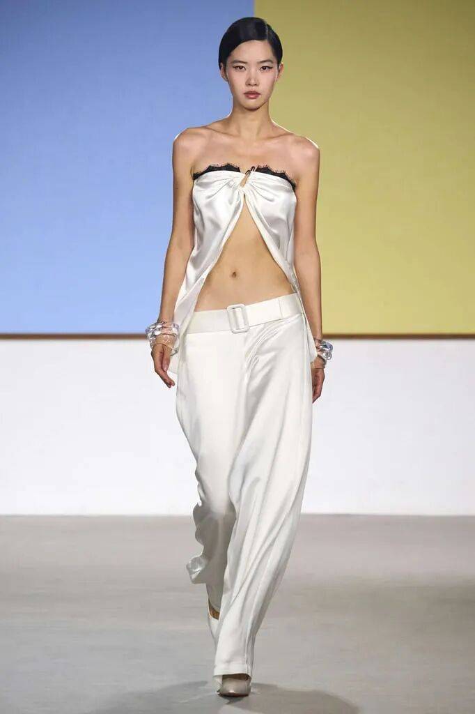 白色颜色的服装在抹胸的上半身和直筒裤之间的搭配中,休闲利落也多了不少的气质感,还在质感的对比中也更多一些奢华高级感,上衣以开叉的设计增加了一些线条和设计感。