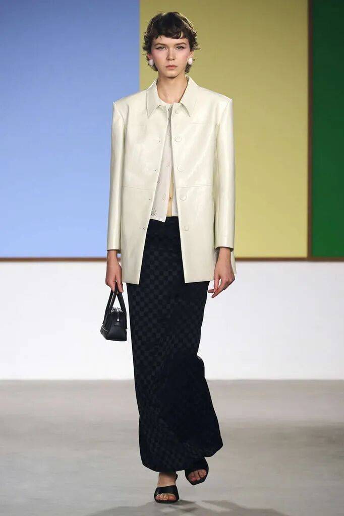 在经典黑白色彩的对比中,白色上衣在宽松的线条上,挺括的面料也多了一些利落精干的气质,以光泽面料也增加了不少材质的纹理质感和奢华华丽的高级感。