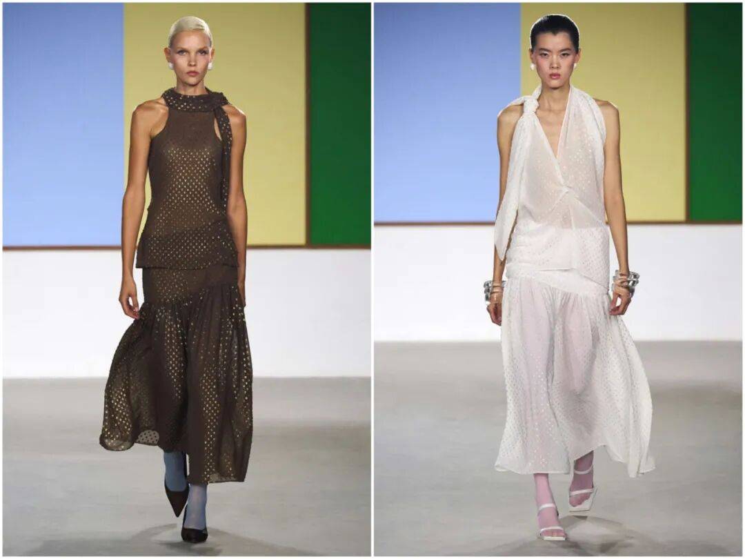 无袖款式的裙装在连衣裙的优雅温婉中,面料增加了不少材质的纹理质感,轻薄的材质也多了几分清透的优雅,还在挂脖、褶皱等设计之上,也有更多细节多了时髦的设计感。
