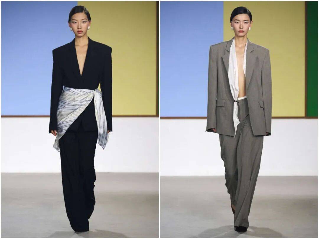 西服款式为主的套装穿搭上,气质强势干练也在纯色的简约中更多了一些气场,纯色的简约在腰间的打结丝巾、白色内搭等设计的出现,让纯色的西服套装也有着不少细节的装饰感。