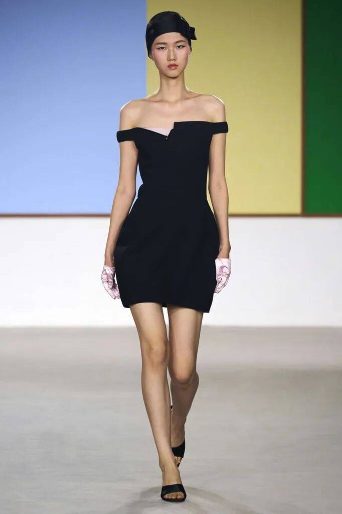 一字肩的修身黑色裙装在一字肩的设计中,露出了肩颈位置的曲线感,修身展现了腰肢线条,短款的裙装也露出了不少腿部的线条感。
