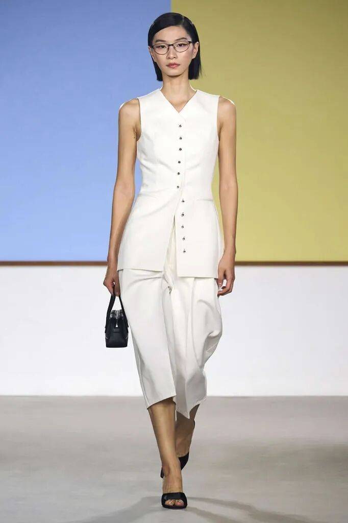 白色颜色的服装在套装的穿搭中,纯白色颜色的简约大方也更多了极简的休闲日常感,还在宽松廓形的线条上,以一些纽扣元素的出现,多了细节的时尚。