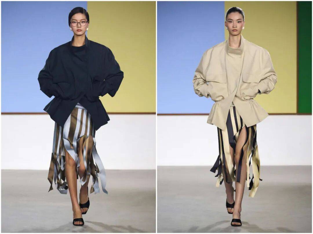休闲的夹克上衣在藏青色、卡其色等颜色的低调大方中,纯色的简约也在廓形线条上增加了不少的休闲日常感,还在肩袖位置透着几分慵懒随性,以撞色条纹的裙装进行搭配,在条纹的经典中结合裙摆的切割流苏线条,则多了不少的设计感。