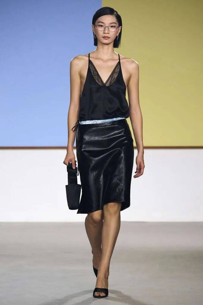 吊带的上衣和黑色皮裙之间的搭配,在这些黑色颜色的稳重大方中,光滑的面料在不同材质的光泽质感上也多了一些材质的差异感,而腰间的位置,一些小面积浅色颜色的出现更是打造了吸睛的亮点。