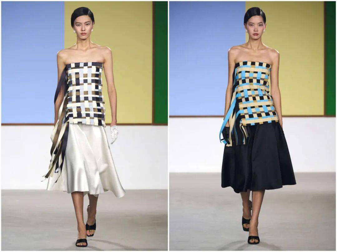 Atelier系列进一步创新:面料条带编织成袖子并向前折叠成裙,碎麻织物构建立体格纹。