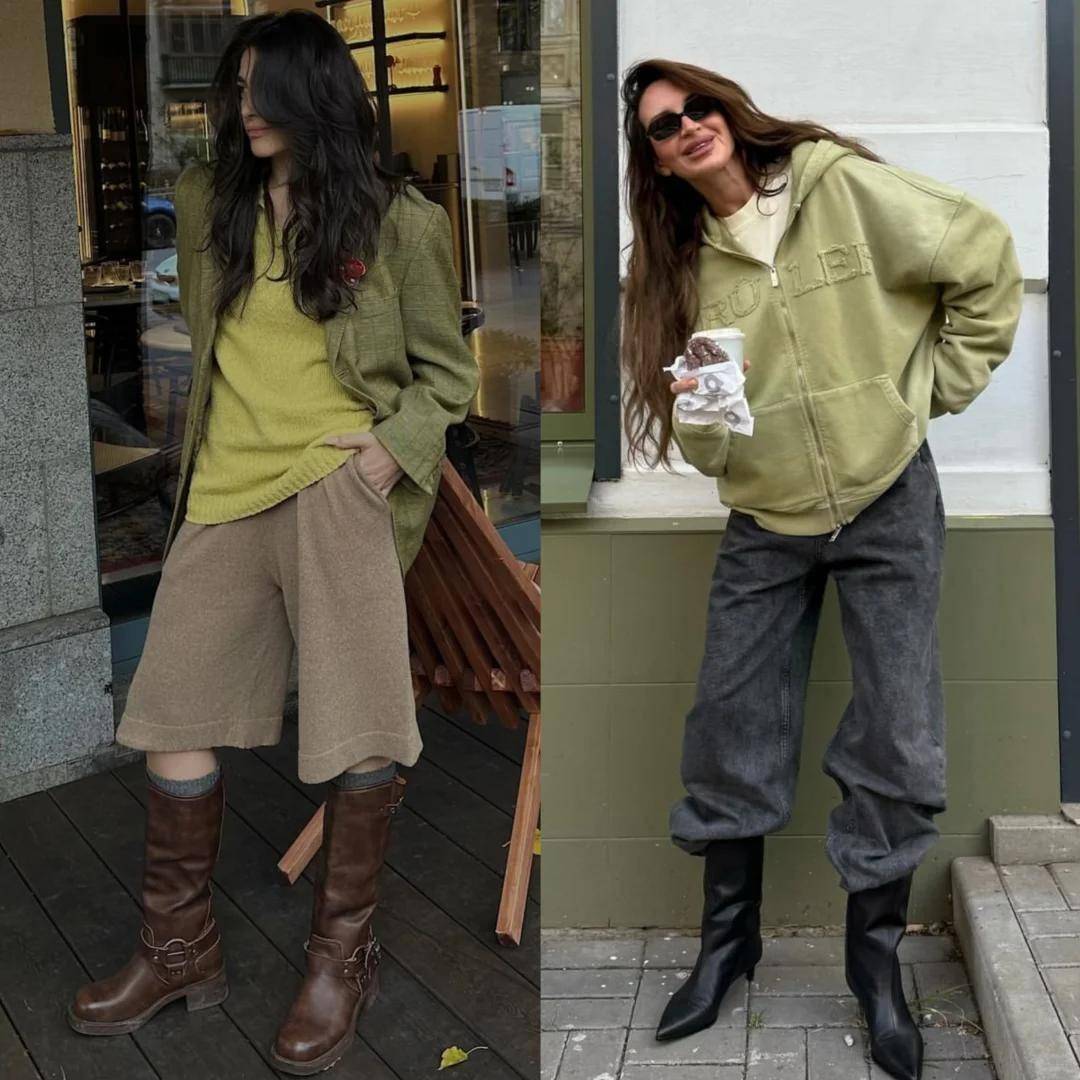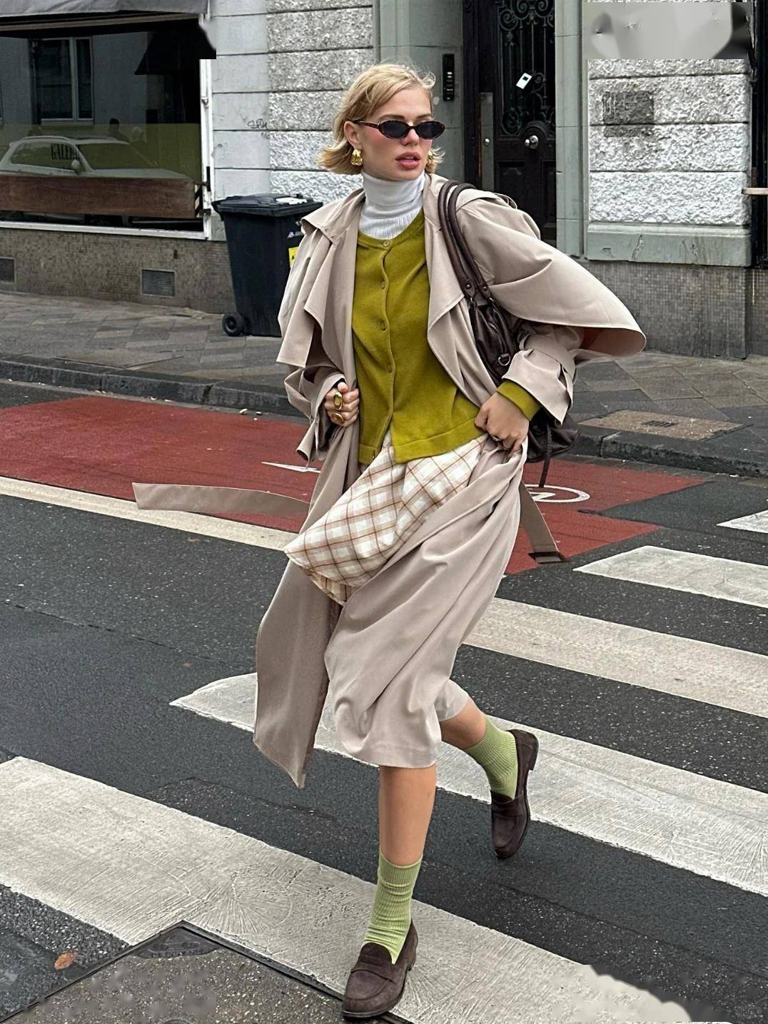 绿色袜子:穿绿毛衣 / 绿外套时搭配,脚踝细节呼应上衣,精致感翻倍;配灯芯绒、麂皮绒单品,同色系强化或棕绿撞色,复古感升级。