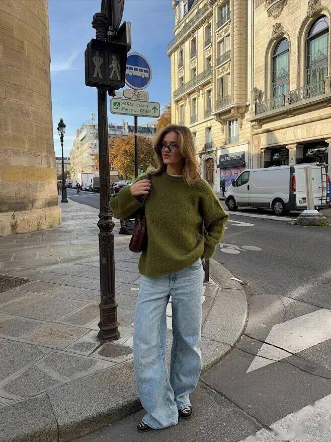 苔藓绿毛衣 + 浅蓝直筒牛仔裤:随手一拍都上镜,氛围感拉满;