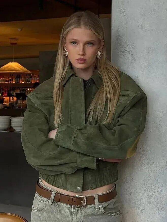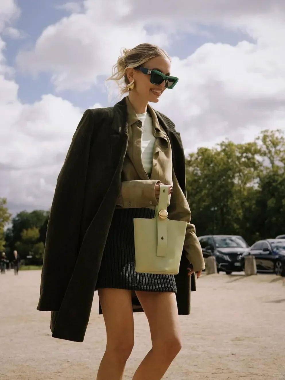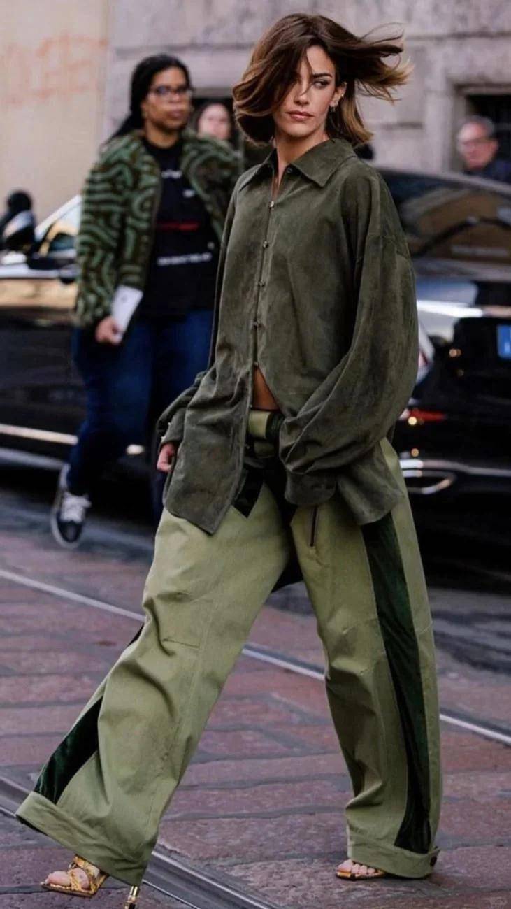 军绿、灰绿的工装风单品是今年爆款,硬挺材质自带军装感,利落轮廓上身飒爽 —— 既保留工装的复古硬朗,又靠绿色注入鲜活气息,单靠版型和颜色就很出片,是 “拍照神器”。