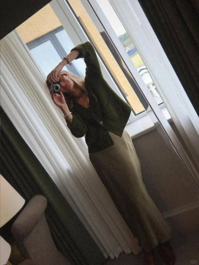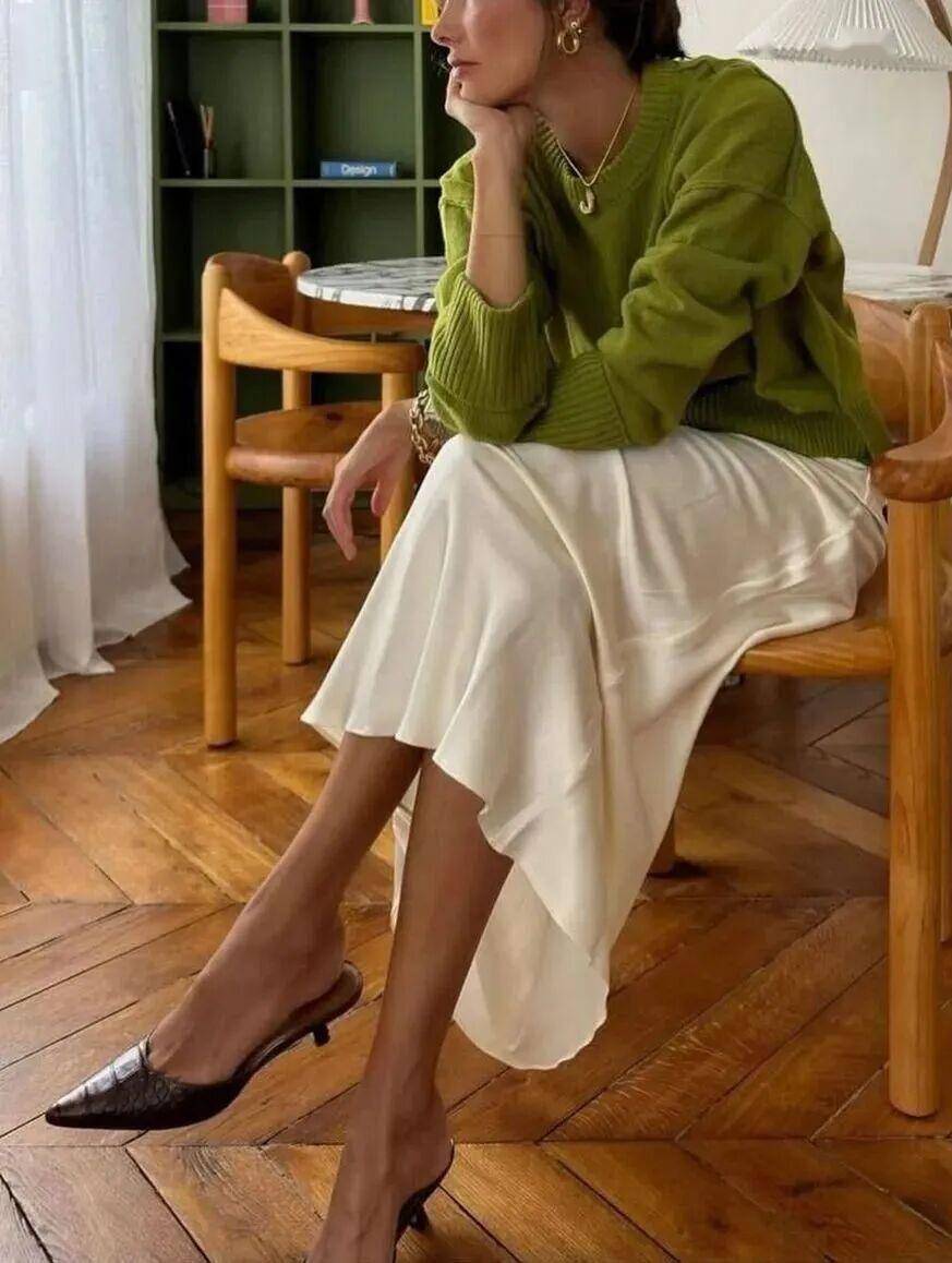 绿毛衣 + 缎面裙:一键切换优雅职场风,温柔与精致平衡,上班穿显气质又专业;