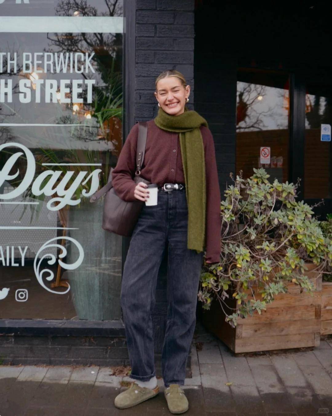 绿色围巾:搭黑 / 灰 / 驼色基础款外套,一抹绿色打破沉闷;