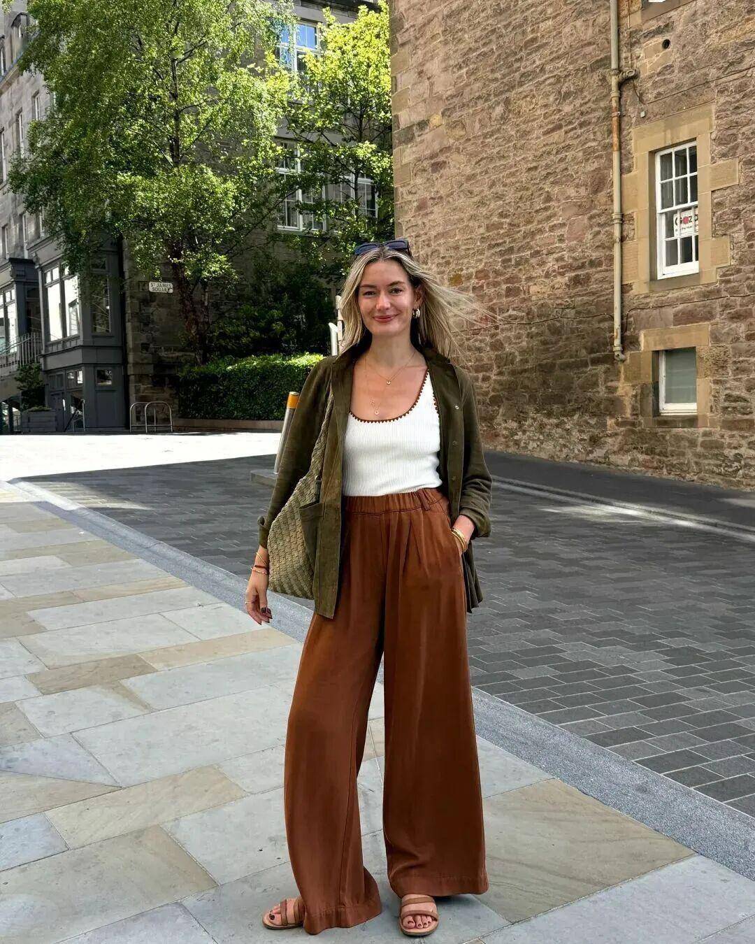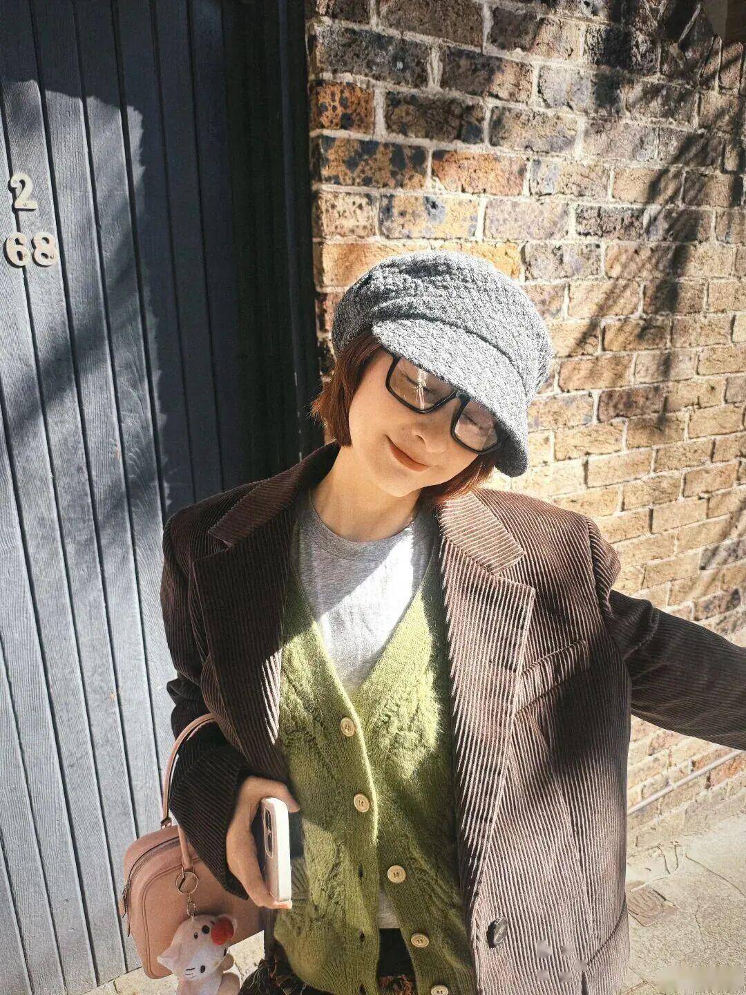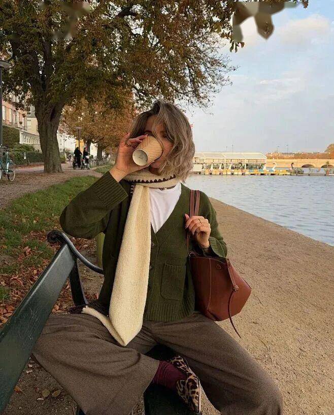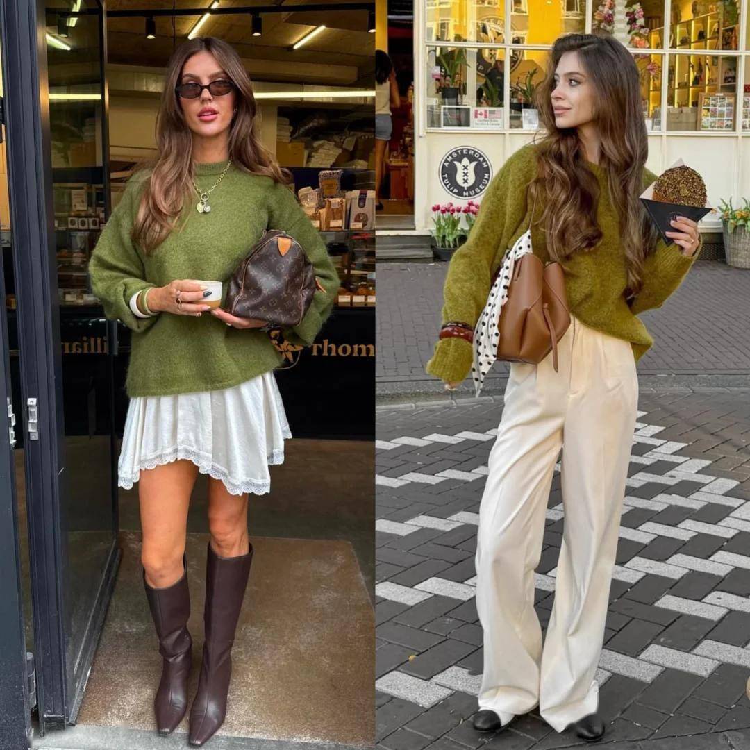绿毛衣当内搭 + 棕色系单品(卡其裤、棕咖灯芯绒裤):绿色鲜活中和棕色厚重,色调和谐高级,新手也能驾驭;