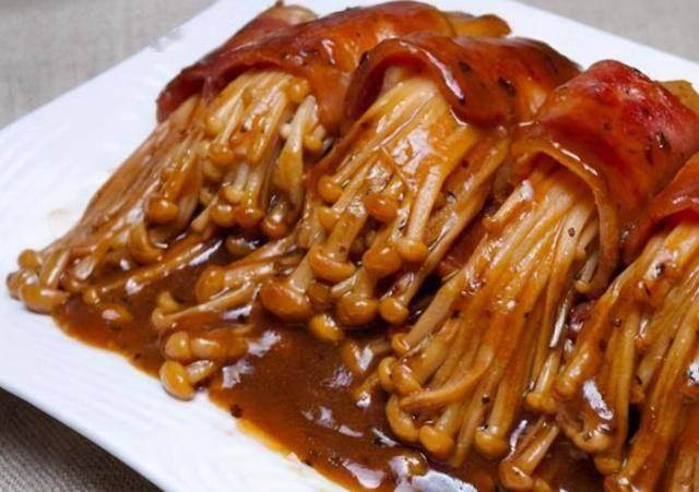 做法:培根卷金针菇用牙签固定,煎至金黄后加蚝油等调料焖煮,装盘去掉牙签。