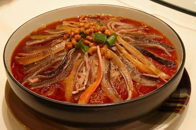 做法:炒香姜蒜和辣椒后加鳝鱼,倒入鲜汤煮沸,加粉丝和调料收汁,撒葱花。