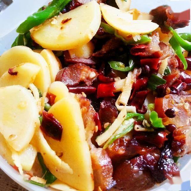 做法:腊肉蒸熟切片,土豆切片焯水,炒香腊肉和土豆后加青椒翻炒均匀。