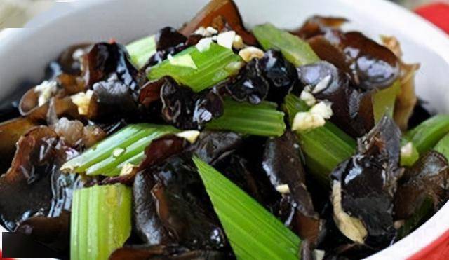 做法:西芹和木耳焯水后过凉,蒜末淋热油,加盐、香醋、生抽调汁,拌匀食材。