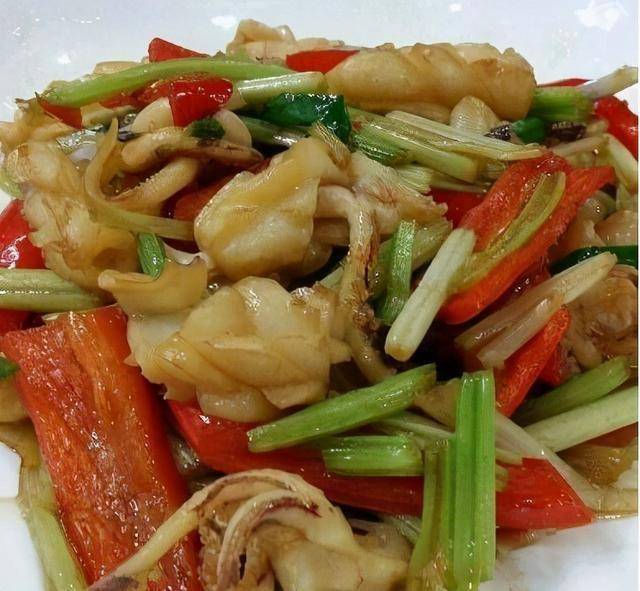 做法:鱿鱼焯水,芹菜快炒后加鱿鱼、酱油和香油炒匀。