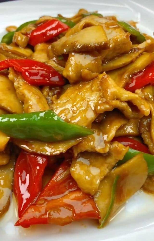 做法:腐竹、木耳、香菇焯水,炒香姜片和剁椒,加料酒和料汁(醋、糖、老抽、生抽、生粉)翻炒。