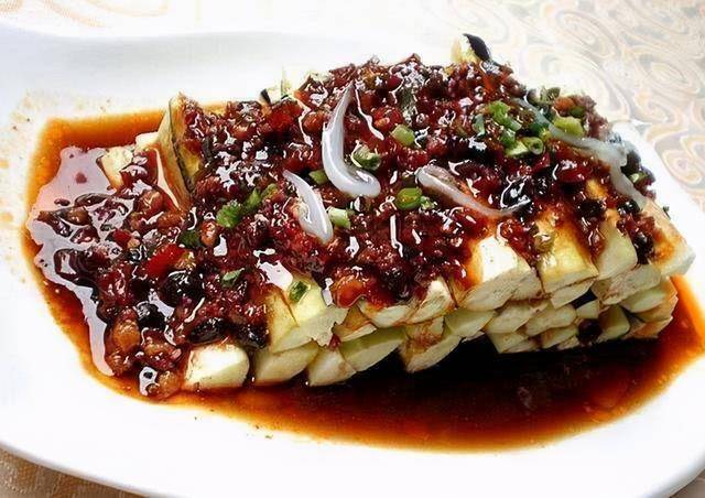 做法:茄子蒸熟撕条,调酱汁(生抽、料酒、鱼露、糖),热油炒香姜末后加酱汁,最后拌入蒜末和青椒末,淋在茄子上。