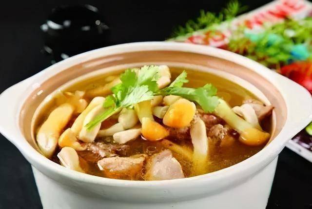 做法:鸡肉炒干水汽,加茶树菇和鲜汤煨制,放入鸡油菌、鸡血和面筋,调味后淋藤椒油。