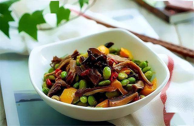 材料:毛豆 100克、猪肚 70克、黄彩椒 一个、黑木耳 10克、红辣椒 3个、蒜蓉 4克