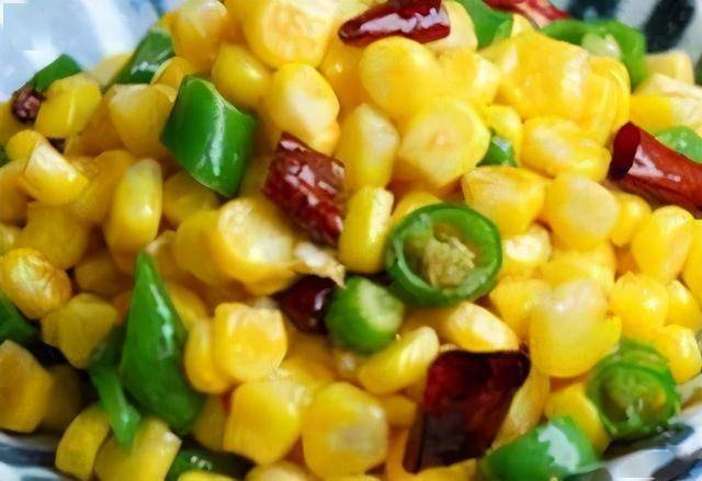 食材:新鲜玉米300克、青尖椒20克、胡萝卜50克、盐2克、味精1克、胡椒粉1克、黄酒10克、豌豆淀粉5克、色拉油30克