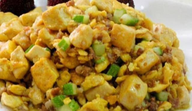 材料:北豆腐1盒,鲜香菇4朵,胡萝卜1根,尖椒1根,橄榄油4汤匙(60毫升),豆豉辣酱2汤匙(30克)