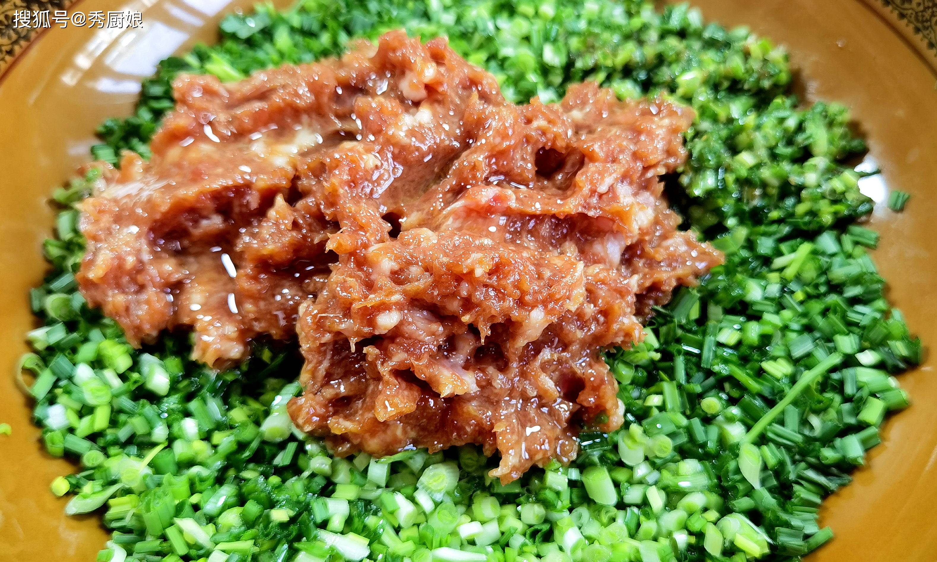 猪肉馅放进大碗,加两勺生抽、半勺老抽、一勺料酒、一小勺糖、适量盐、食用油和花椒粉。生姜剁成末加进去。关键来了:往一个方向使劲搅打,边搅边分次加入少量清水,大约小半碗水,直到肉馅变得黏稠上劲,这样馅料才鲜嫩多汁。最后把用香油拌过的野葱倒进来,轻轻拌匀,馅料就准备好了。