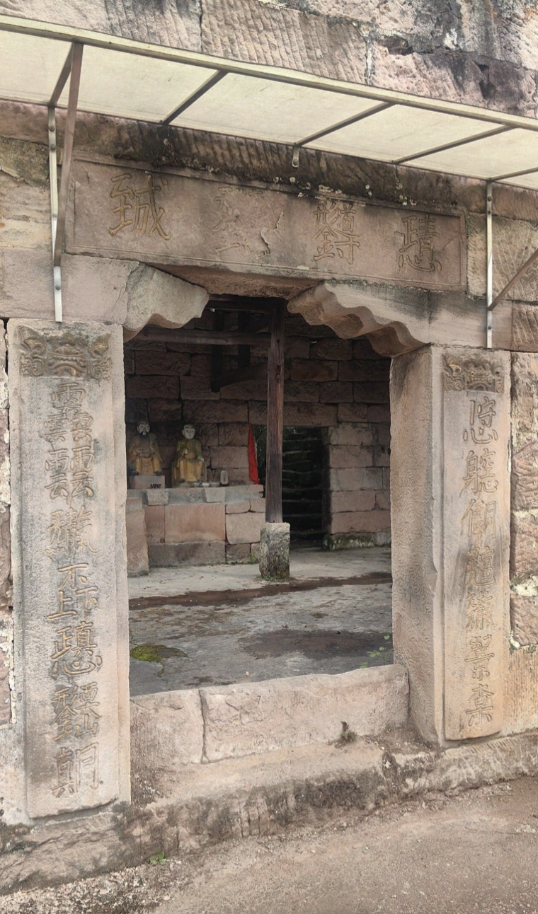 原路返回走下山方向,发现另一道寨门,寨门旁有一处观音阁,两边的楹联写着“佛梵遥临瀛岛,法云长护斗山”。
