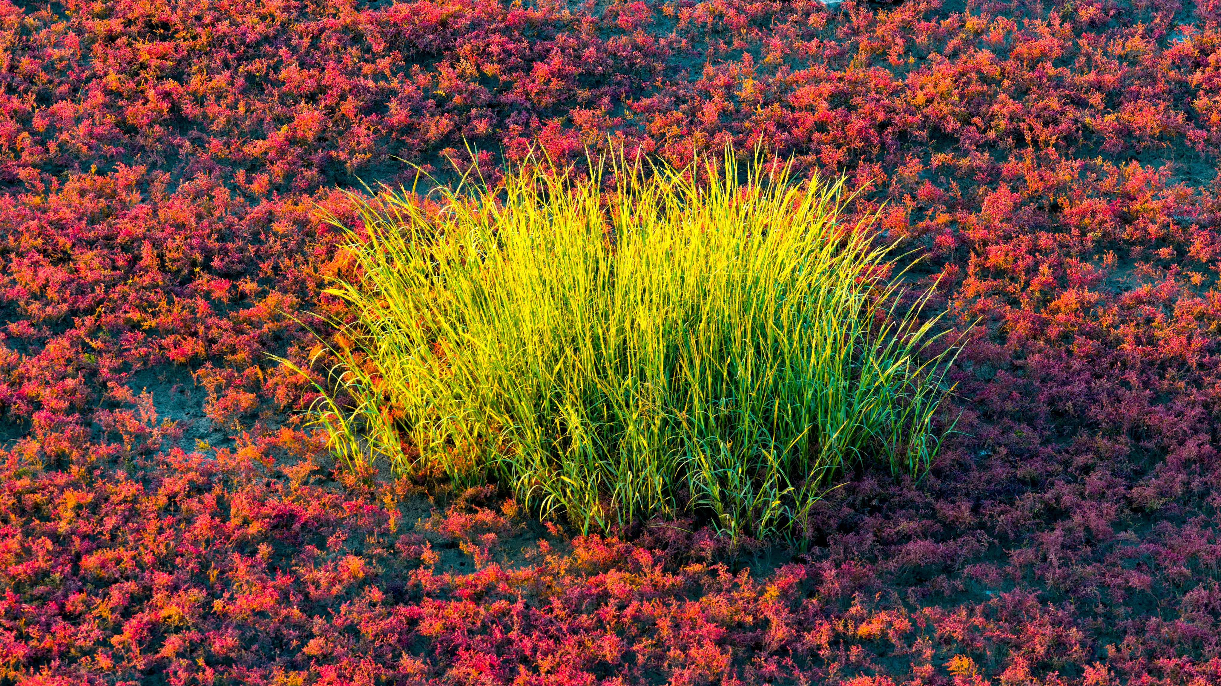 直到九十月,秋阳把温度揉进每一片针叶,碱蓬才骤然迸发出全部的热烈,让原本沉寂的滩涂捧出秋日限定的红色奇观。