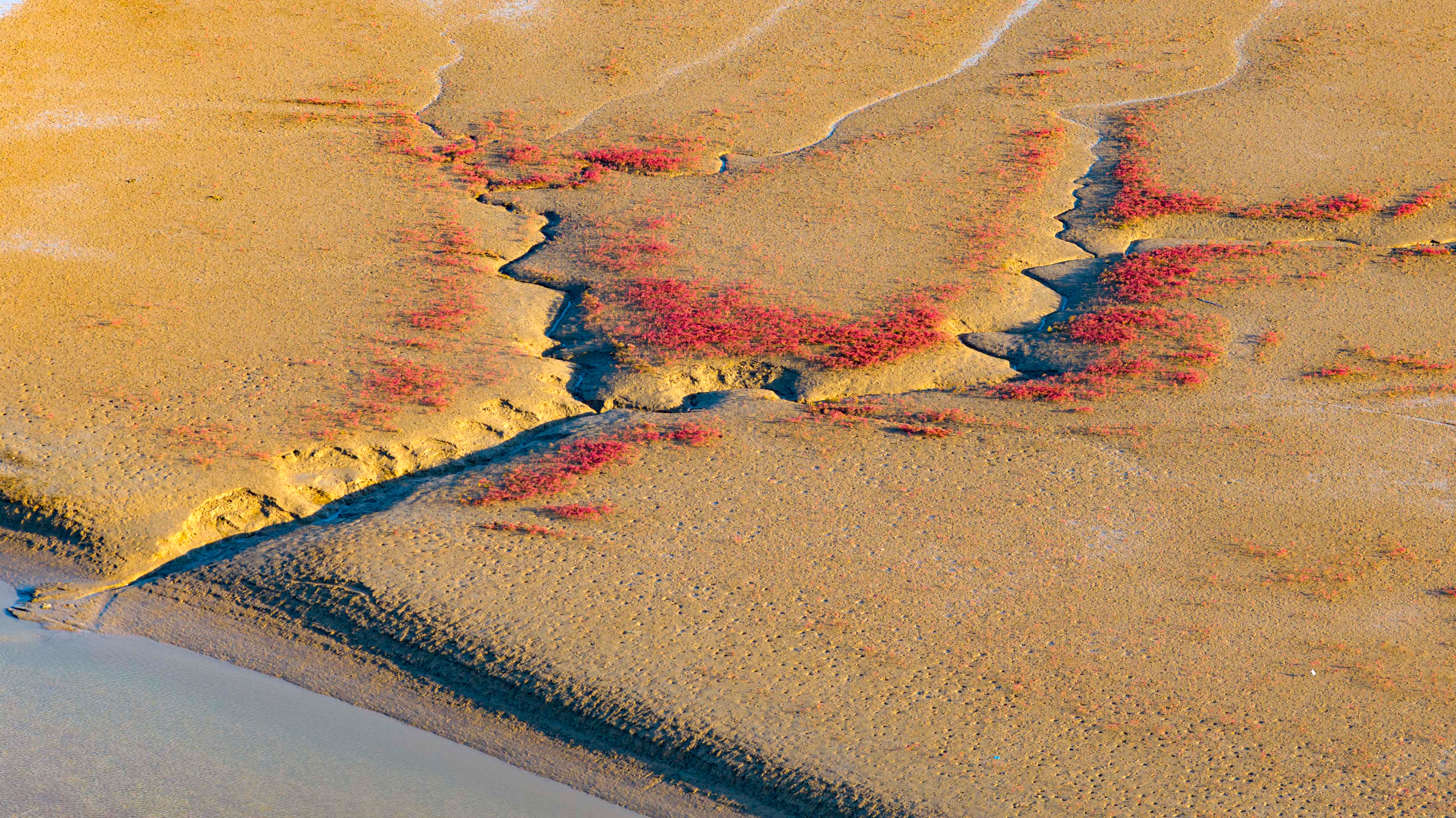 瞧,退潮后的滩涂褪去了海水的蓝,露出赭褐色的底,而盐地碱蓬便从这卤渍重重的泥土里挺身而出,一簇簇、一丛丛,把五河口和胶州湾交汇的河海湿地染成了流动的红云。
