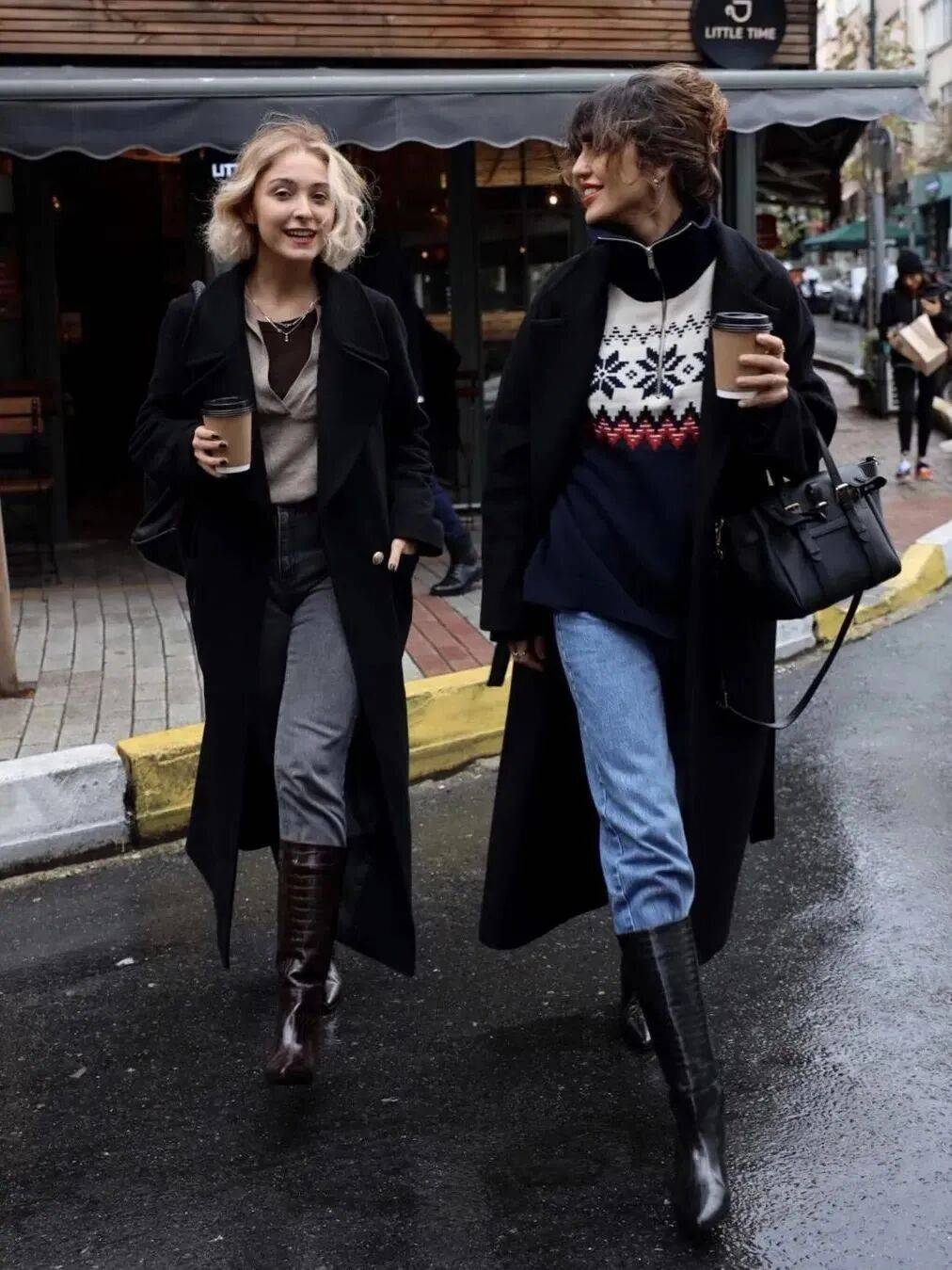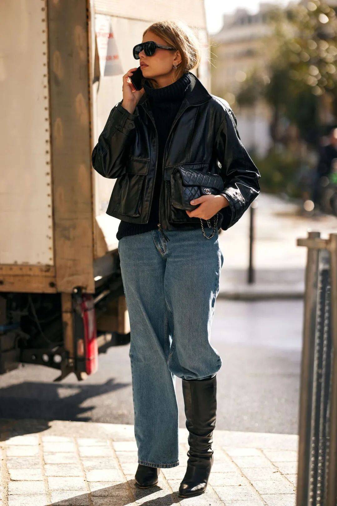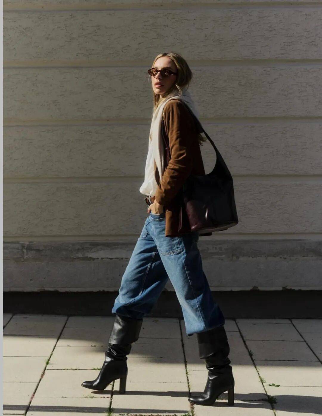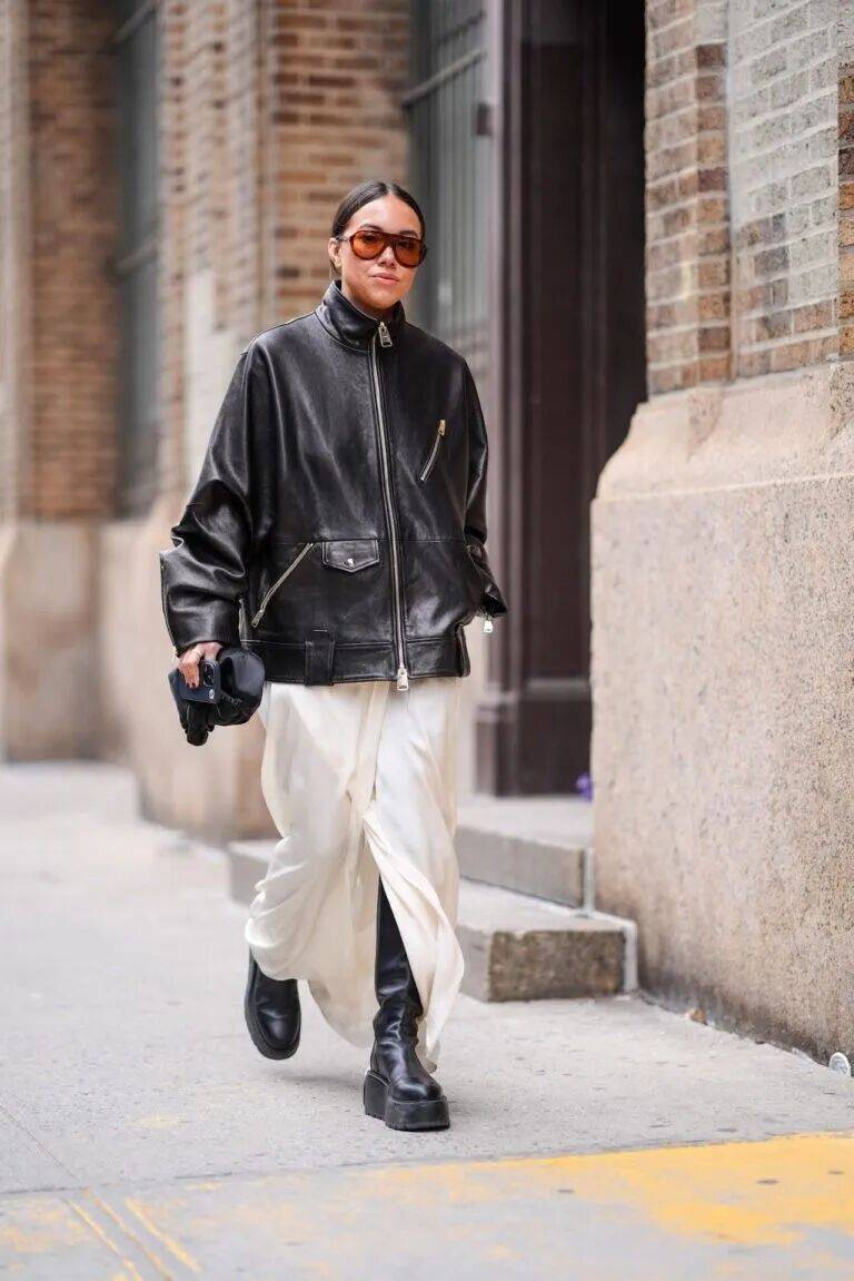 宽松长裤配小黑靴时,裤管部分进入靴筒,边缘轻轻堆叠,随性又有型。