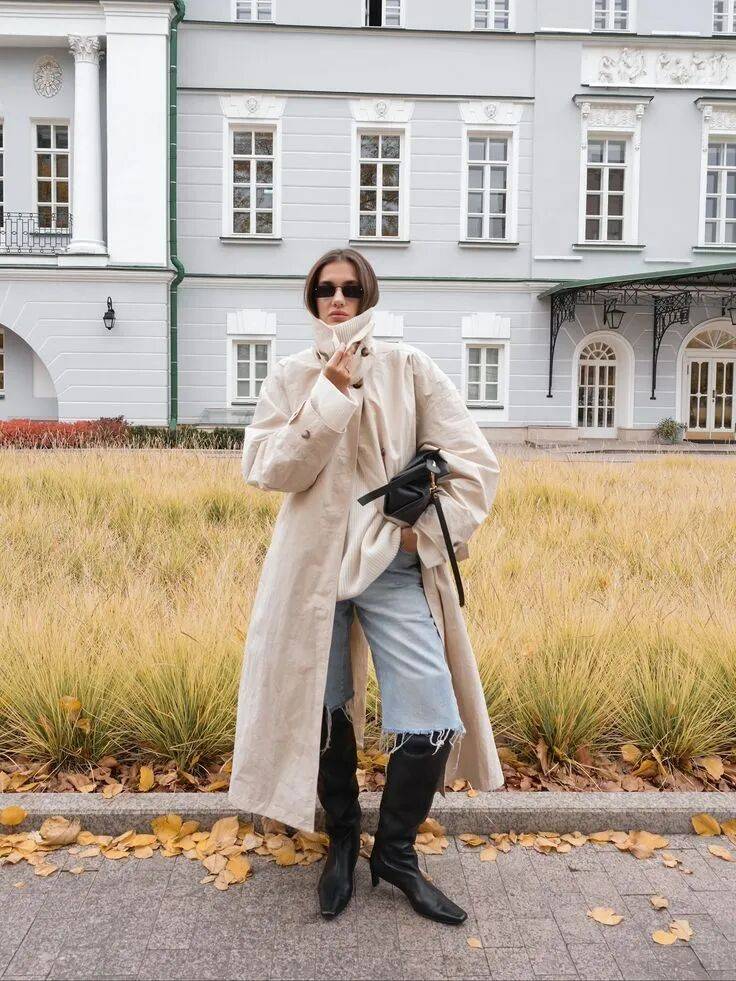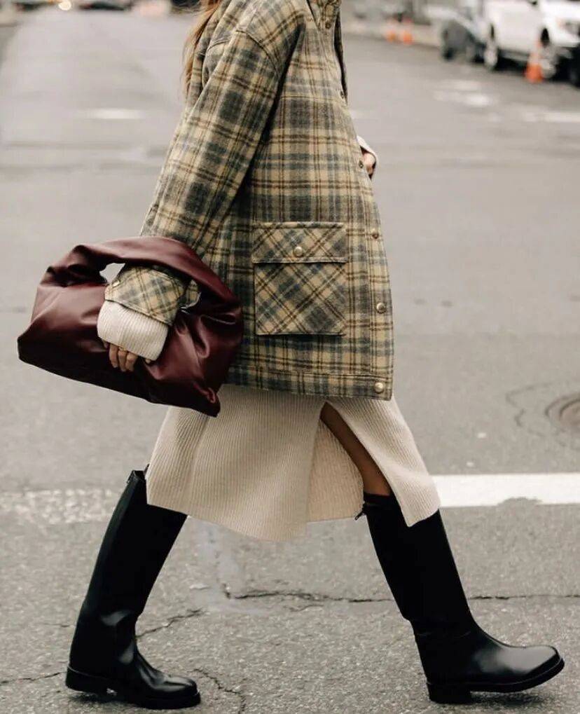 如果希望整体更轻盈一点,让裙摆稍微短一点露出一小段靴筒,,或者选择轻盈的面料,会化解秋冬本身的厚重感。