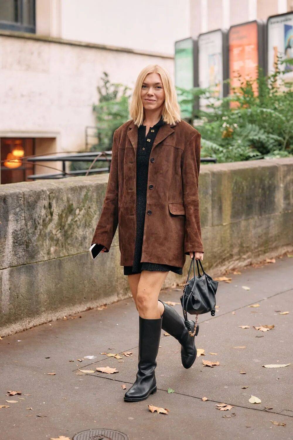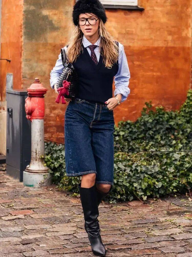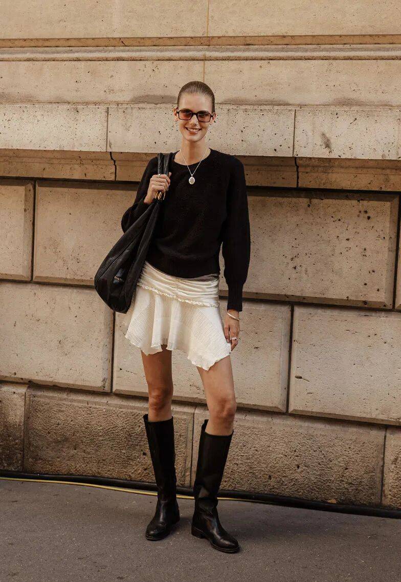 短裙轻快,小黑靴稳重,两者叠加后,是秋冬最容易形成风格对比的组合。