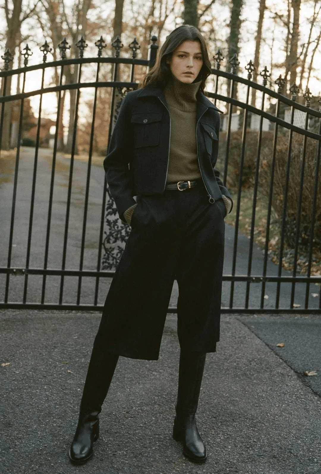 裤长落在膝下或小腿中段,靴筒在同一区域立起,裤管将靴口处轻轻覆盖,两条线自然衔接,不会出现尴尬的截断。