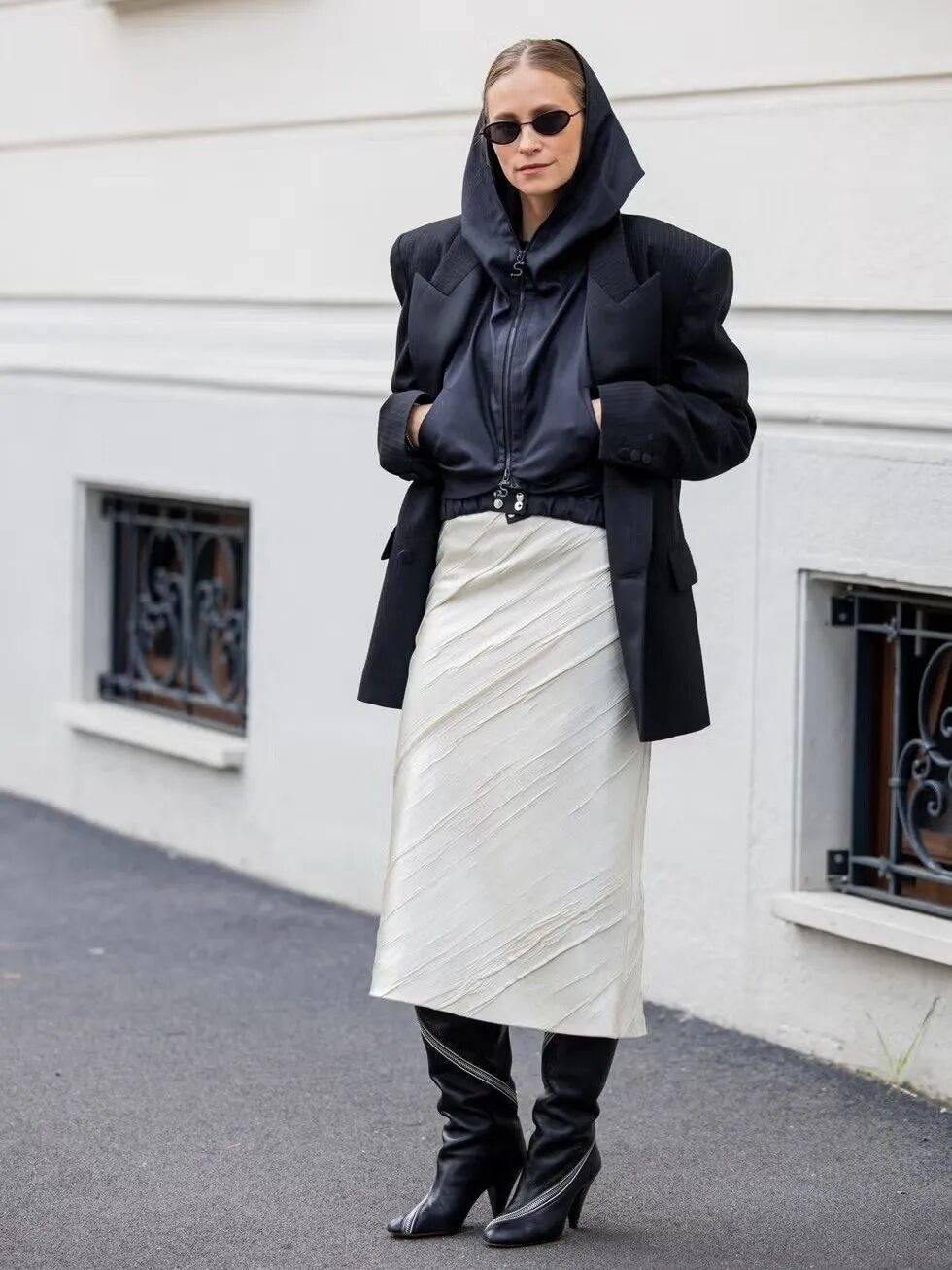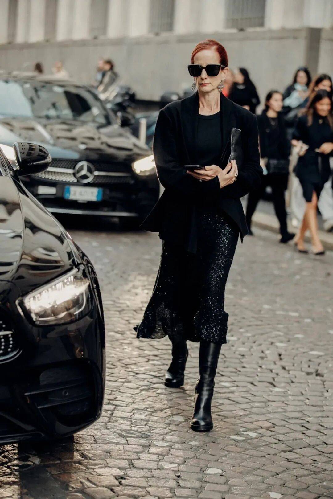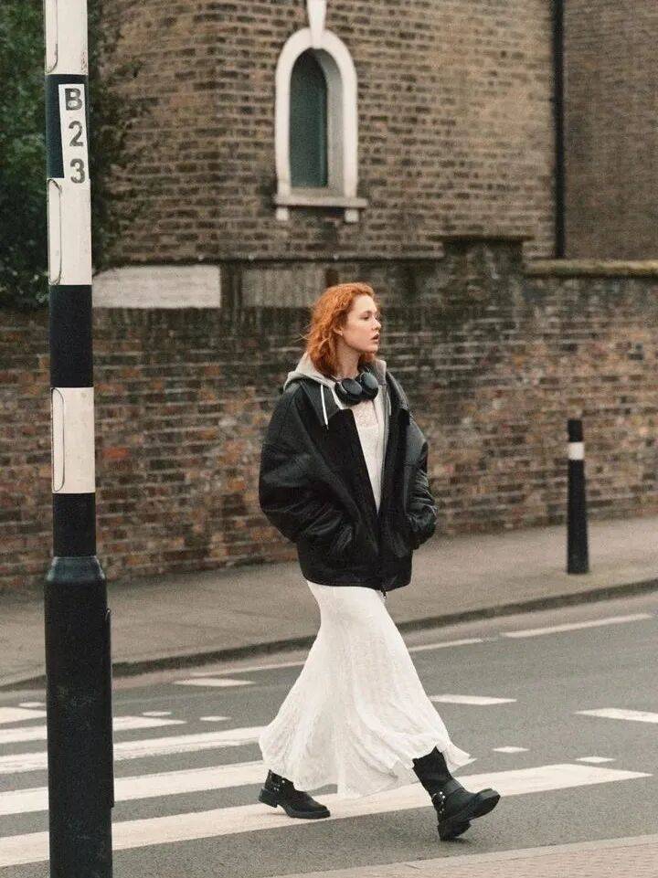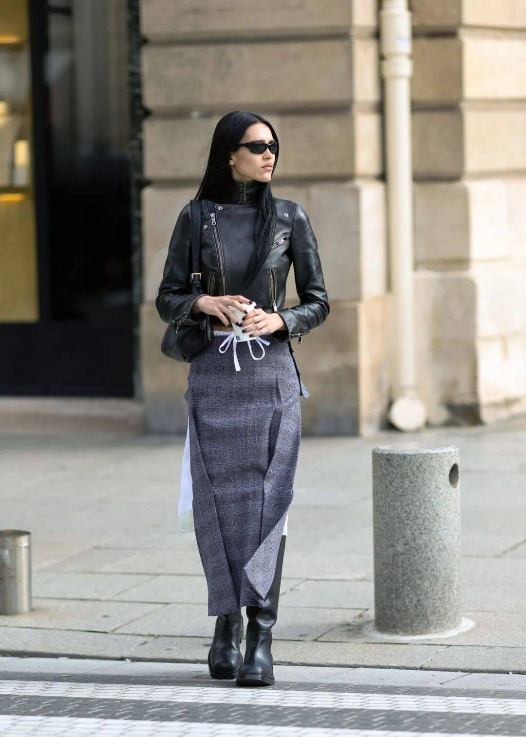 裙摆如果完全盖住靴筒,有种神秘疏离的气质,落在靴筒上沿附近,会更干净利落。深色长裙配黑靴尤其利落,也很适合通勤和正式场合。