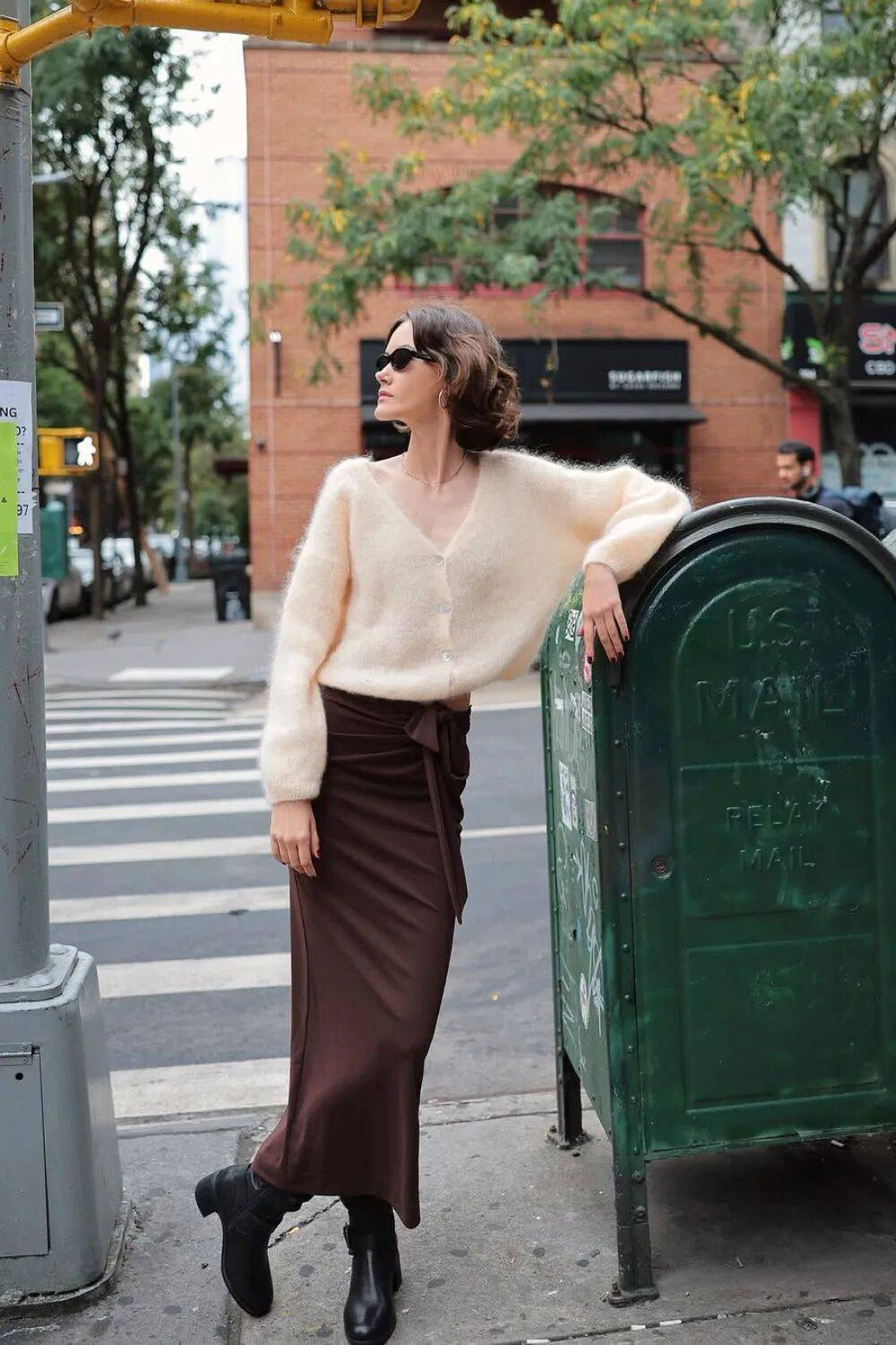 这组搭配仍需注意裙摆不宜过蓬,直线条或微 A 版型能让比例更干净流畅,即使成熟女性穿着也会穿出气场,不会太幼态。