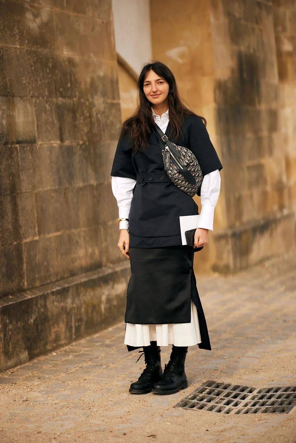 小黑靴的线条干净,能将短裙的轻快收住,使造型不过于甜美,也更适合秋冬氛围。