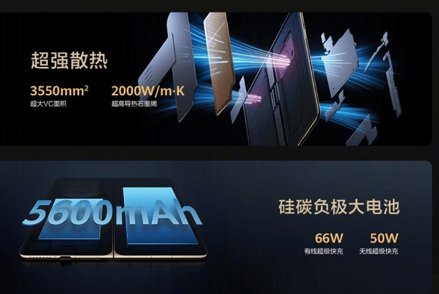 续航配置:5600mAh大电池,支持66W有线快充 + 50W无线快充。