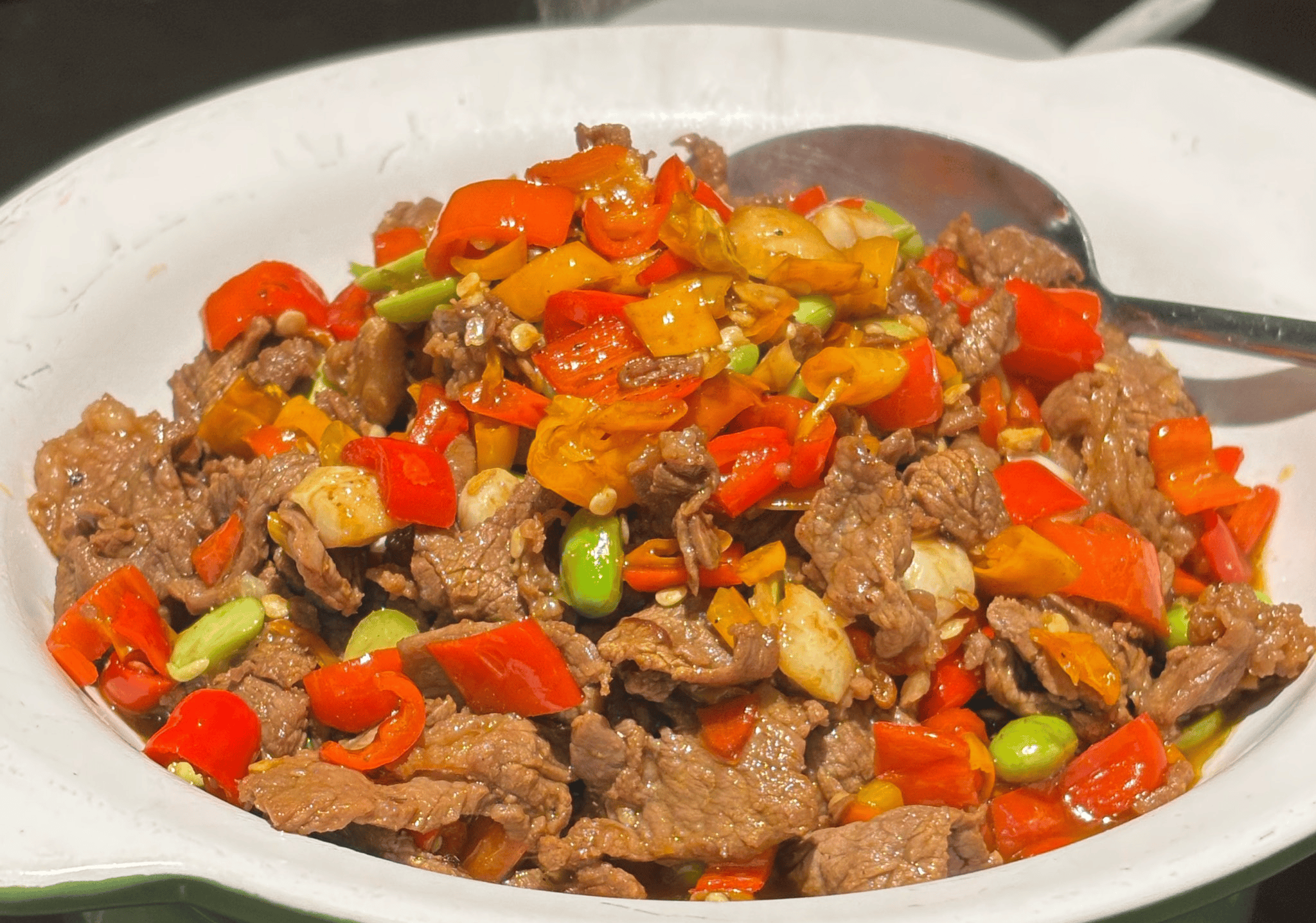 湖南的小炒黄牛肉,是把牛肉的鲜发挥到极致的一道菜。选用新鲜的牛里脊,切成薄片,用生抽、料酒、淀粉腌制入味,搭配青红辣椒、蒜片大火快炒,翻炒时间不能超过一分钟,才能锁住牛肉的鲜嫩。