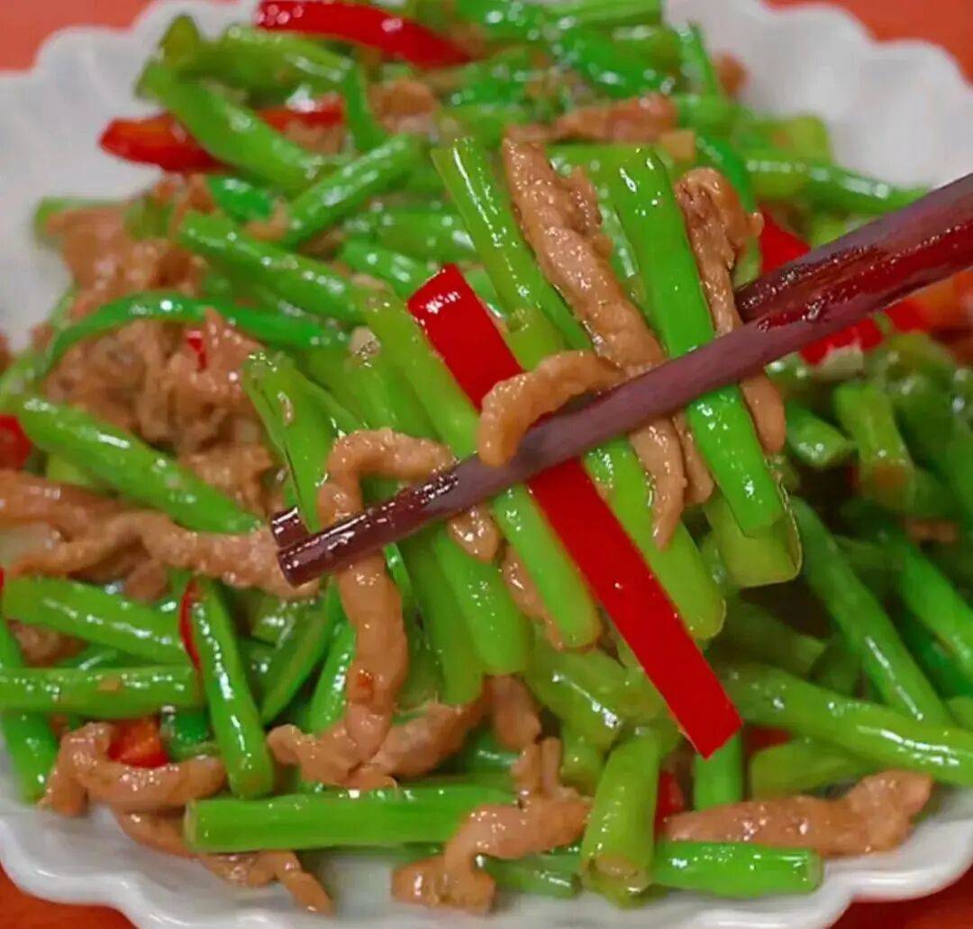 做法:瘦肉切条,豆角去筋切段,尖椒切丝;锅中放油烧热,下入瘦肉煸炒出油;加入蒜末尖椒和豆角翻炒均匀,调入生抽、老抽上色,加少许糖提鲜,炒至豆角熟透即可。