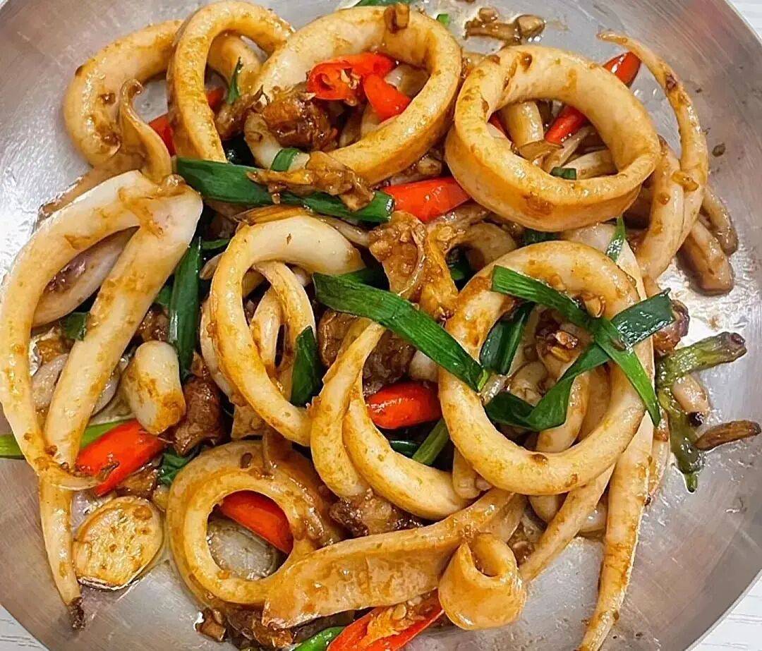做法:鱿鱼洗净切丝,用开水焯水去腥;锅中放油烧热,下入葱蒜和辣椒煸炒出香味;加入鱿鱼丝快速翻炒,撒入适量沙姜粉增味,炒至鱿鱼熟透即可。