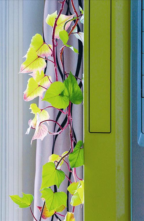红薯:今年春天把发很多枝芽的大红薯放在玻璃盆中搁在客厅立式空调上,绿中带紫的枝叶似绿萝般垂下,郁郁葱葱一个夏天。